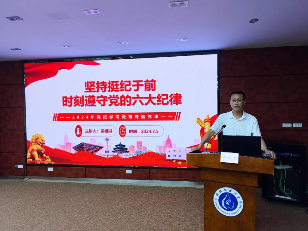 7月5日下午,学校党委委员、副校长袁祖洪以《坚持挺纪于前时刻遵守党的六大纪律》为题,为机关三支部全体党员讲授党纪学习专题党课。