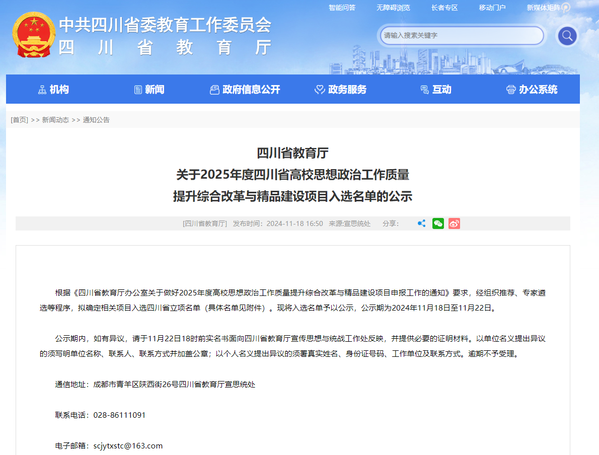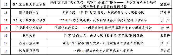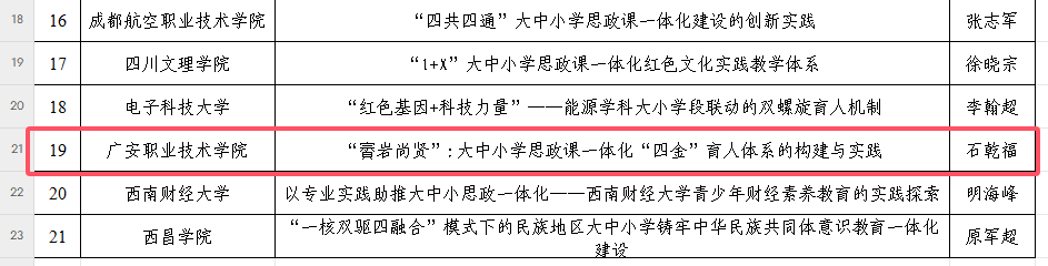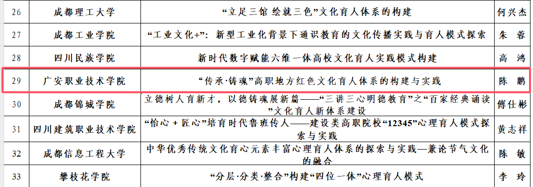 近日,四川省教育厅公布了2025年度四川省高校思想政治工作质量提升综合改革与精品建设项目入选名单,ac米兰申报的《“传承•铸魂”高职地方红色文化育人体系的构建与实践》《中国人民的儿子》《不原谅也没关系——一例复杂性创伤经历高职学生的心理辅导案例》《“賨岩尚贤”:大中小学思政课一体化“四金”育人体系的构建与实践》4个项目成功入选公示名单(其中2个项目被推荐参加教育部精品建设项目遴选)。
