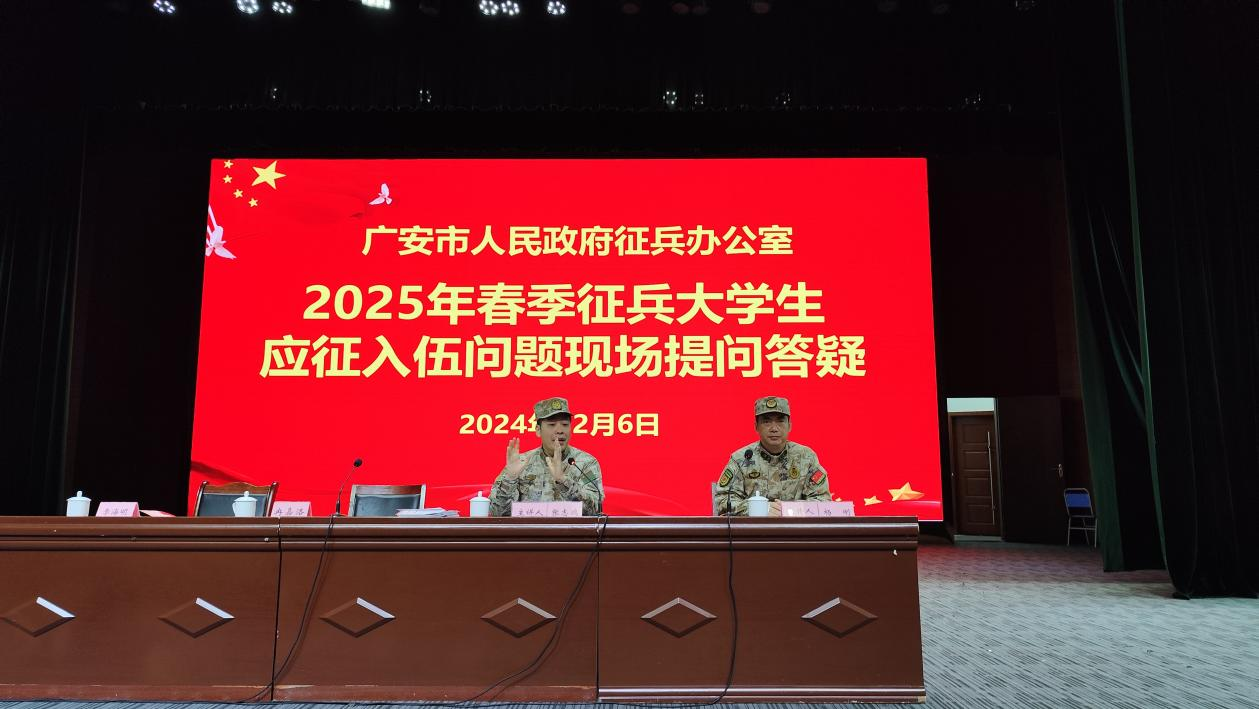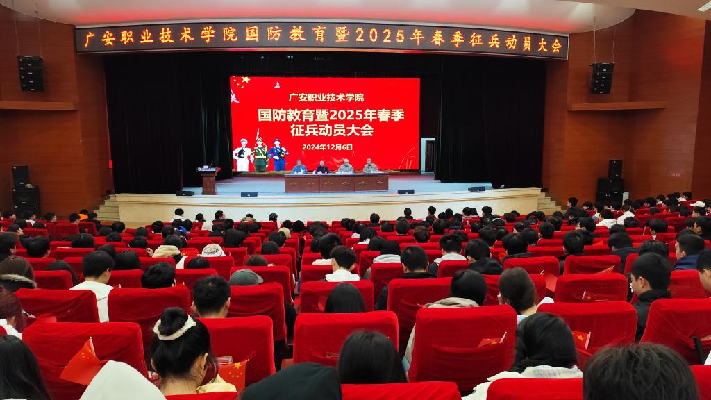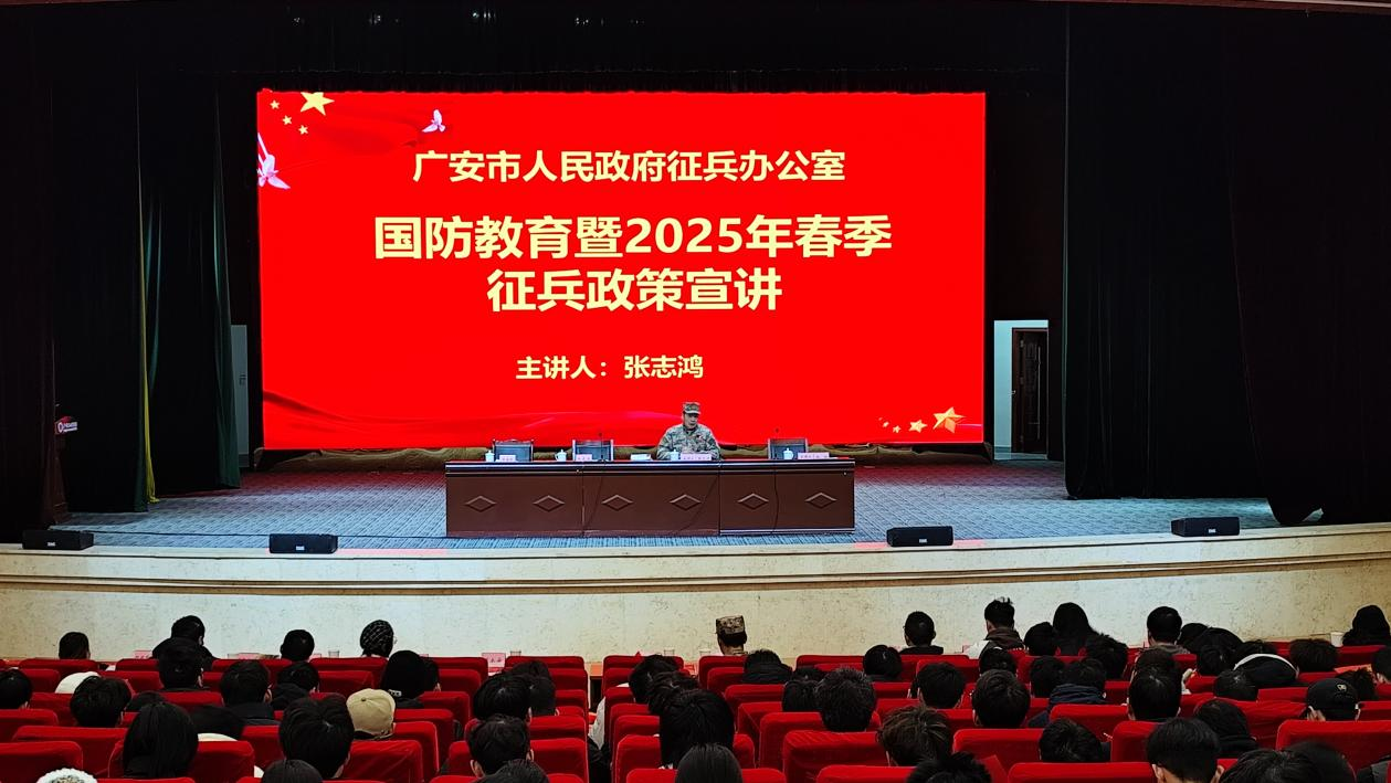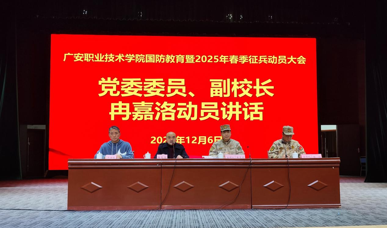 12月6日上午,学校在杏坛召开国防教育暨2025年春季征兵动员大会,学校党委委员、副校长冉嘉洛出席大会并作动员讲话,广安军分区动员处处级正职参谋张志鸿作国防教育暨征兵政策宣讲,会议由学校武装部副部长、保卫处副处长杨刚主持。