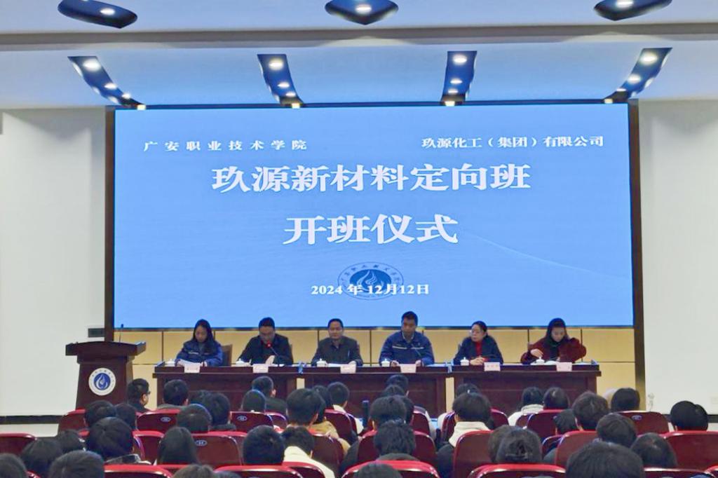 为进一步落实学校产教融合的工作部署,推进玖源新材料产业学院建设,2024年12月12日下午玖源新材料定向班开班仪式在ac米兰官网中文网站希贤厅隆重举行。广安玖源化工有限公司人力资源负责人傅元松、广安玖源电子材料有限公司人力资源负责人李莉、材化学院全体教师以及定向班学生参加开班仪式,由新材料与化学工程学院党总支书记赵渊主持。