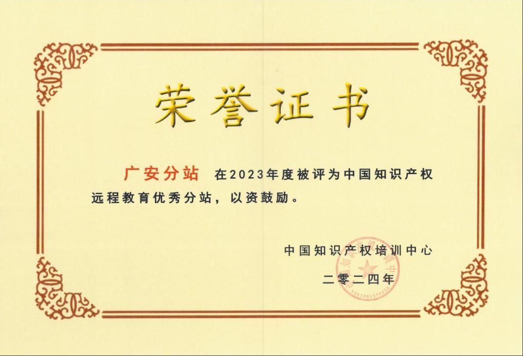 近日,中国知识产权培训中心公布了中国知识产权远程教育总平台对2023年度全国各分站的考核评估结果,ac米兰官网中文网站分站(以下简称广安分站)在全国188个分站中位列第15名,获全国“优秀分站”荣誉称号。