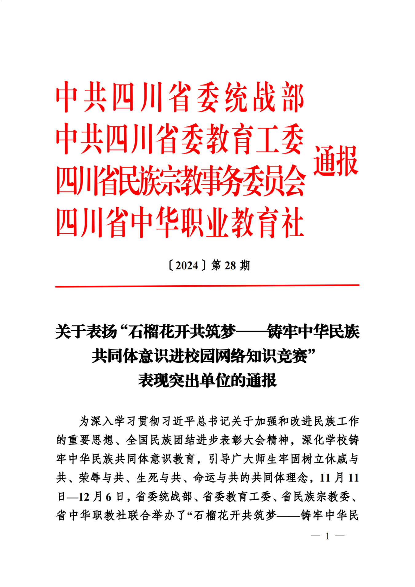 近日,中共四川省委统战部、中共四川省委教育工委、四川省民族宗教事务委员会、四川省中华职业教育社联合发布了《关于表扬“石榴花开共筑梦——铸牢中华民族共同体意识进校园网络知识竞赛”表现突出单位的通报》。全省共有30个学校和单位在此次竞赛中表现突出,荣获表彰,ac米兰是受表彰单位之一。