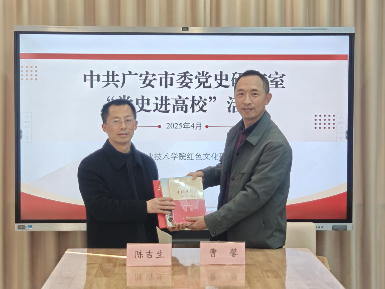 会前,双方在红色文化研究中心举行了党史文献资料捐赠仪式。陈吉生代表市委党史研究室向学校捐赠了《中国共产党广安历史大事记(1921-2021)》《四川省红色遗址普查成果汇编(广安卷)》等珍贵党史文献资料44种110册。