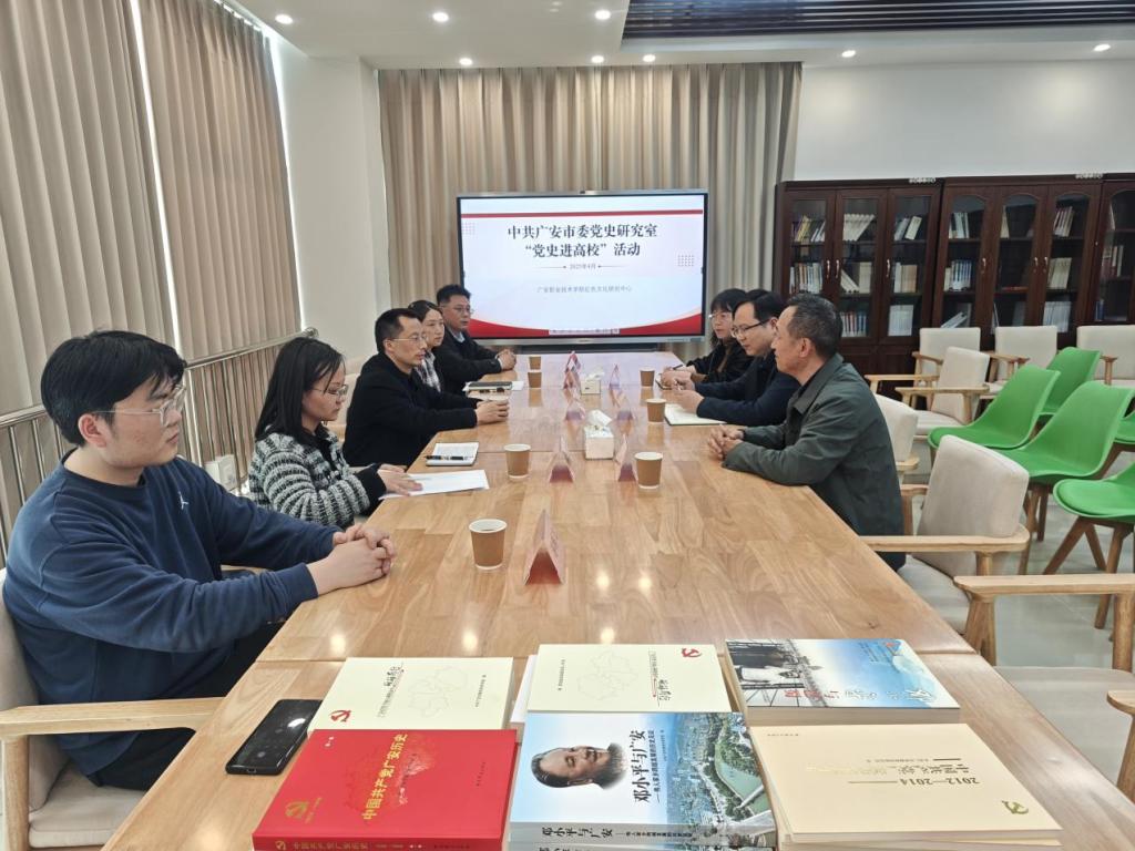 4月7日下午,中共广安市委党史研究室主任陈吉生带队到学校开展“党史进高校”活动。学校党委委员、宣传统战部部长孔新海参加交流座谈,红色文化研究中心主任曹馨主持座谈会。