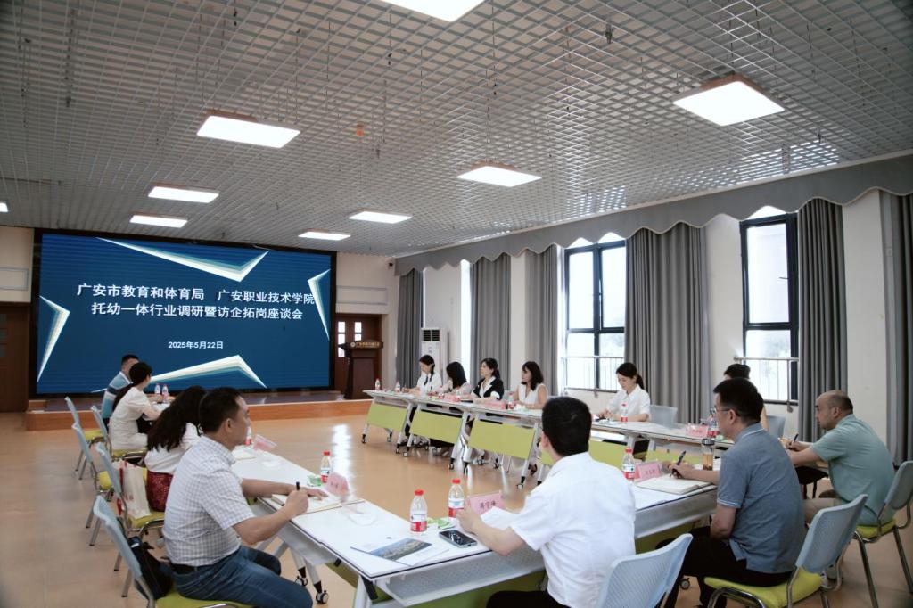 为贯彻落实国家托幼一体化发展战略,深化产教融合协同育人机制,拓宽毕业生就业渠道,5月22日,学校与市教育和体育局共同开展广安市托幼一体行业调研和访企拓岗专项活动。学校党委副书记、校长王义全,市教育和体育局党组成员、副局长蒋宇峰,全程参与调研。