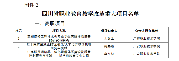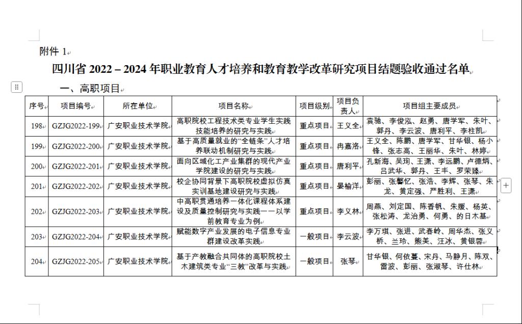 近日,四川省教育厅公布了2022-2024年教学改革研究项目结题验收结果,ac米兰立项的17个项目全部通过验收,其中《高职院校工程技术类专业学生实践技能培养的研究与实践》《基于高质量就业的“全链条”人才培养联动机制研究与实践》《中高职贯通培养一体化课程体系建设及质量控制研究与实践——以学前教育专业为例》3项成果经专家评审、教育厅审核,被认定为四川省职业教育教学改革重大项目。