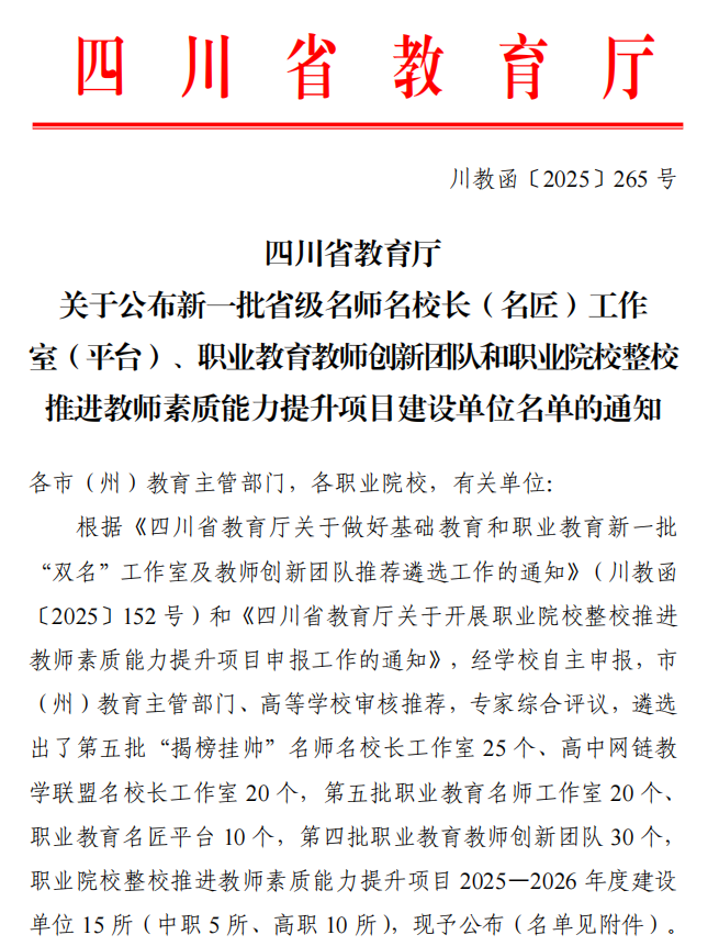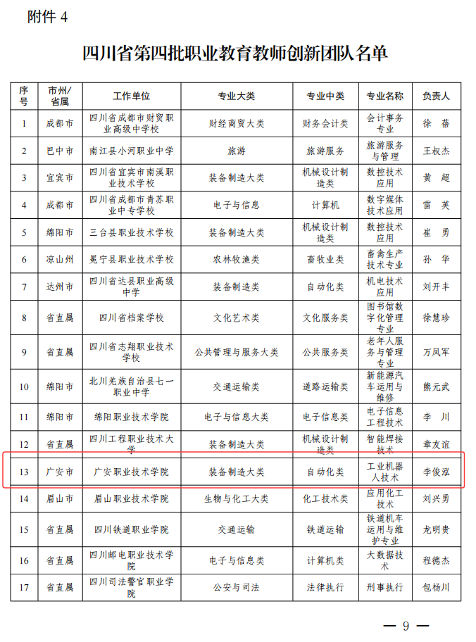 近日,四川省教育厅公布了《关于公布新一批省级名师名校长(名匠)工作室(平台)、职业教育教师创新团队和职业院校整校推进教师素质能力提升项目建设单位名单的通知》,ac米兰由李俊泓教授领衔的工业机器人技术教学团队成功入选四川省第四批职业教育教师创新团队。这是学校工业机器人技术省级高水平专业群建设取得的又一标志性成果。