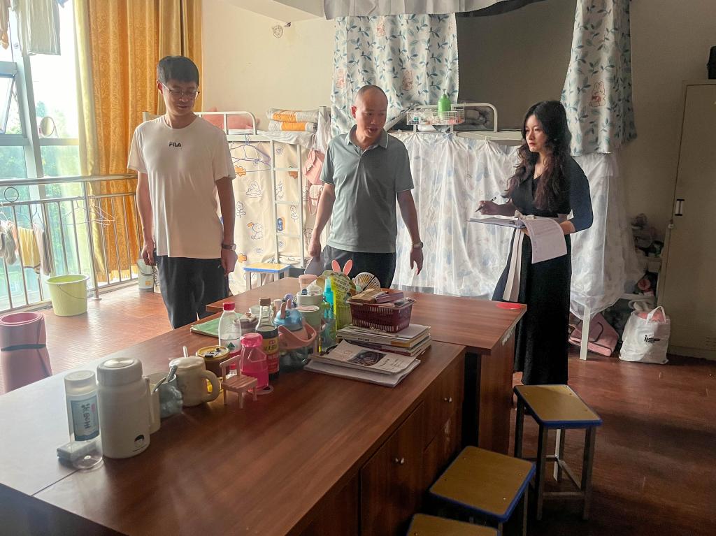6月7日上午,招生与学生工作部组织全体班主任到学生公寓对消防安全、用电安全、高坠风险和卫生状况等方面进行了全面细致的检查。班主任们针对排查出的问题,对学生进行指导、教育,并通过示范寝室内生活物品、用电设备的摆放、演示被子整齐叠放等方式,进一步培养学生良好的生活行为习惯,提高学生在寝室范围内的安全、卫生等行为标准。