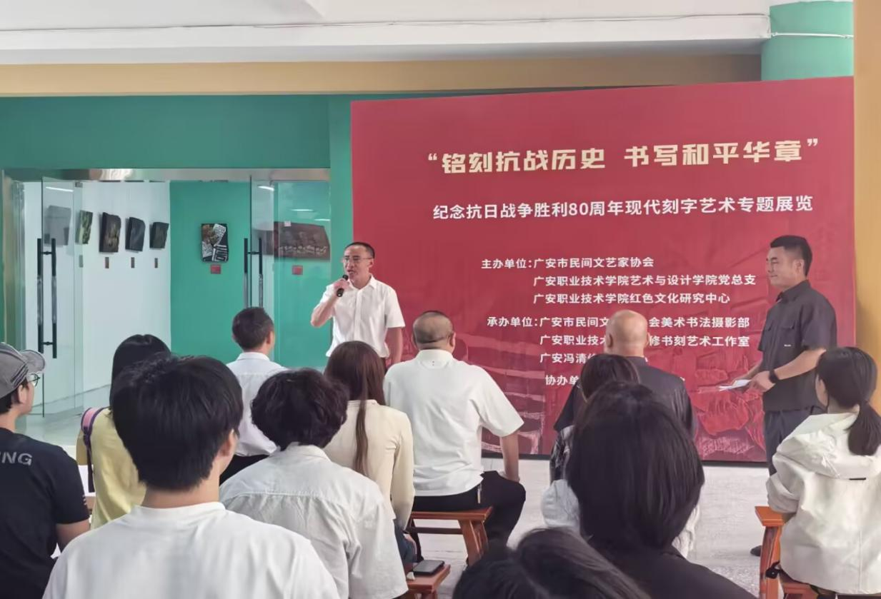 6月25日上午,学校艺术与设计学院党总支、红色文化研究中心联合广安市民间文艺家协会,共同主办的“铭刻抗战历史·书写和平华章”书刻艺术作品专题展,在ac米兰致用楼一楼文创展厅隆重开展。本次展览旨在纪念中国人民抗日战争胜利80周年,通过独特的书刻艺术形式传承红色基因,弘扬抗战精神。