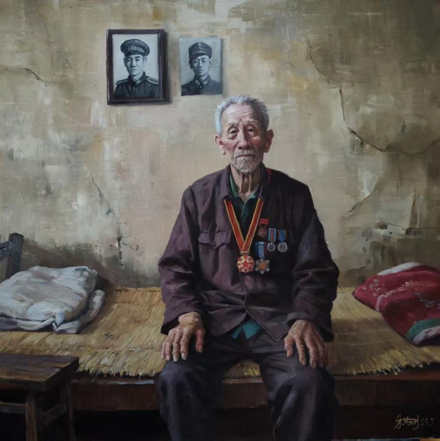 本次展览展出的66幅作品,紧紧围绕抗战历史主题,涵盖中国画、油画、版画、雕塑、书法等多种艺术形式。朱渝刚这件油画作品《卫国英雄以严谨的造型、深沉的笔触和富有历史感的色彩语言,生动诠释了抗战精神与民族气节。一位须发苍苍的抗战老战士,端坐床沿,军姿犹存,沧桑目光穿透历史。背景墙上泛黄照片里,年轻的士兵英气勃发,与眼前枯瘦却坚毅的形象形成强烈时空对话。画家用厚重油彩堆出皱纹与军功章,冷灰床褥与暖黄记忆交织,既是对个体生命的悲悯致敬,更是对民族精神的庄严定格,英雄迟暮,卫国初心仍在燃烧。