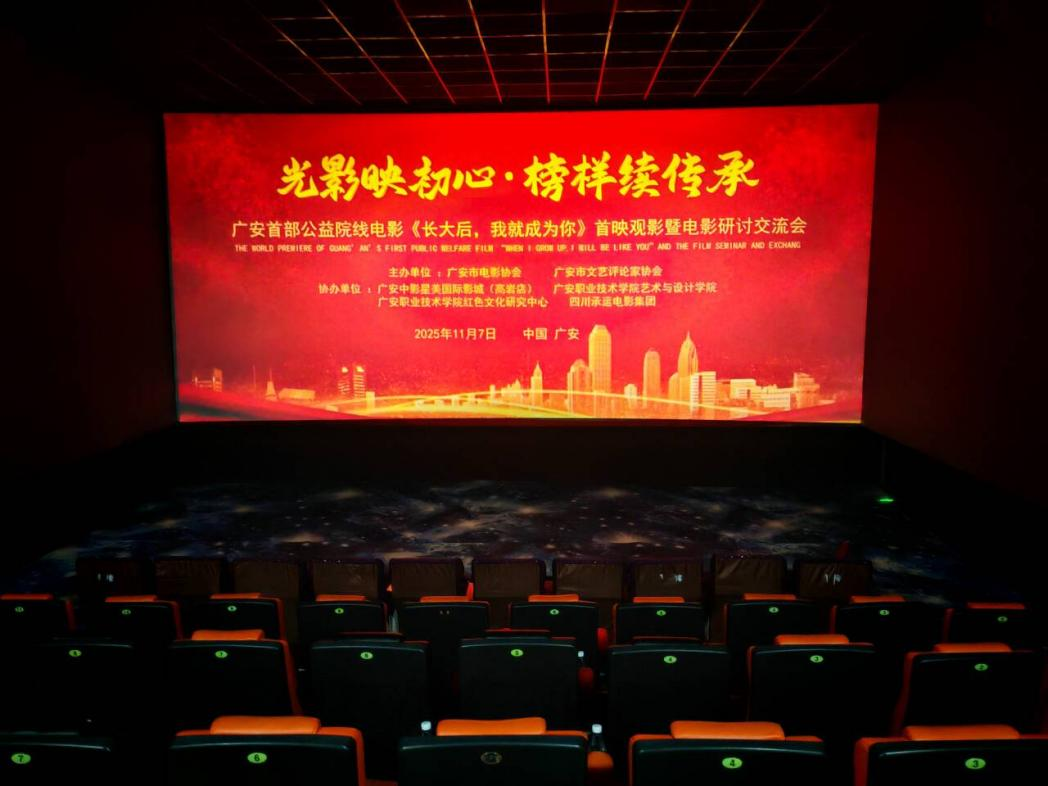 11月7日上午,广安首部公益片《长大后,我就成为你》正式全国上映。由广安市委宣传部指导,ac米兰官网中文网站艺术与设计学院、红色文化研究中心等单位共同主协办完成的“光影映初心·榜样续传承”公益片《长大后,我就成为你》首映式在广安中影星美影视城(高岩店)举行。ac米兰艺术与设计学院院长、市评论家协会主席王雪松,红色文化研究中心副主任唐清华、办公室人员曹馨、向黎立、李沃纹等参加了首映式。