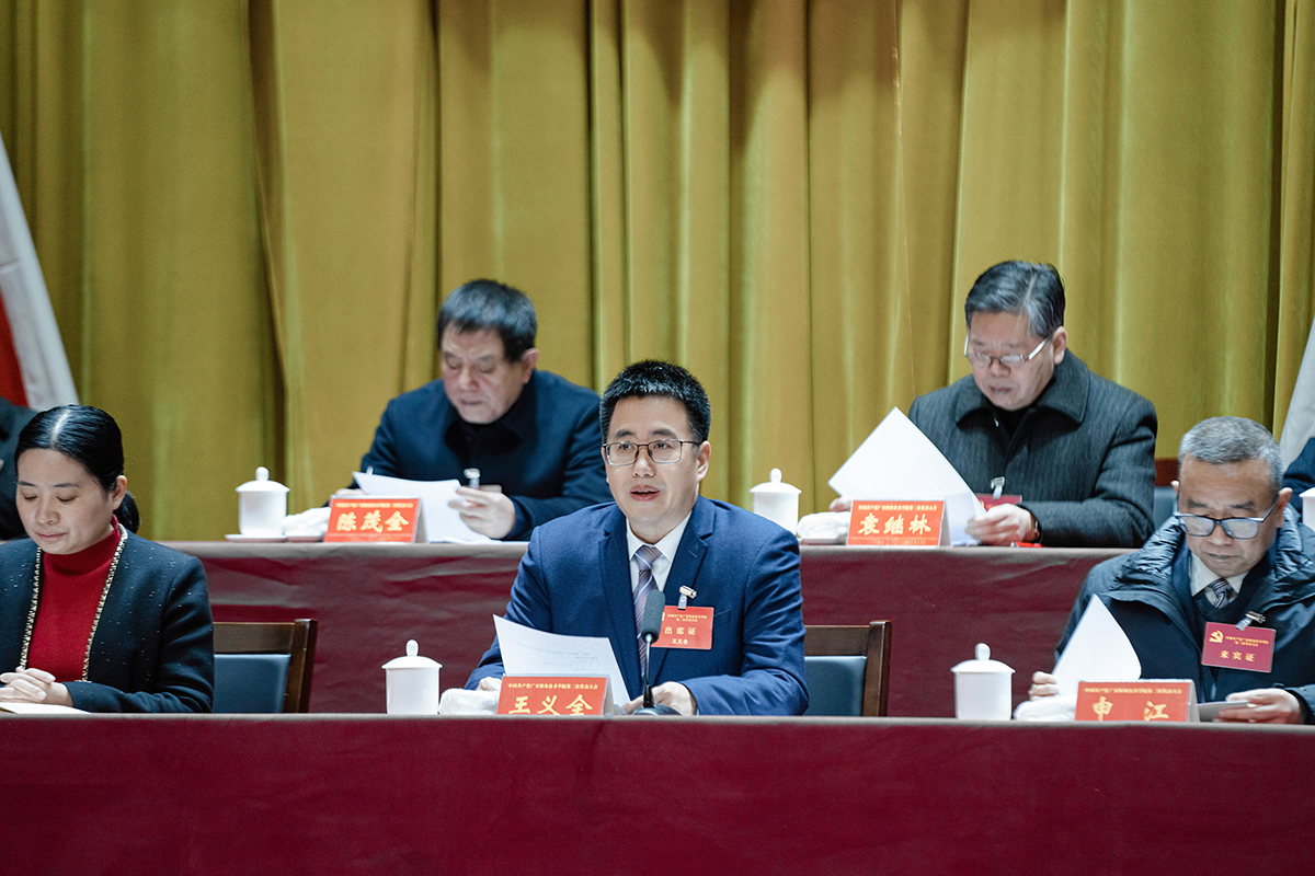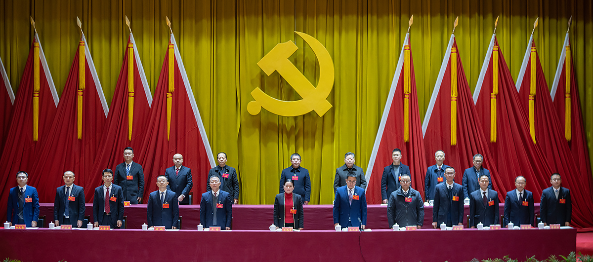 大会会场庄严雄伟,主席台上方金黄色党徽位居正中,十面鲜艳的红旗分列两侧,气氛热烈隆重。