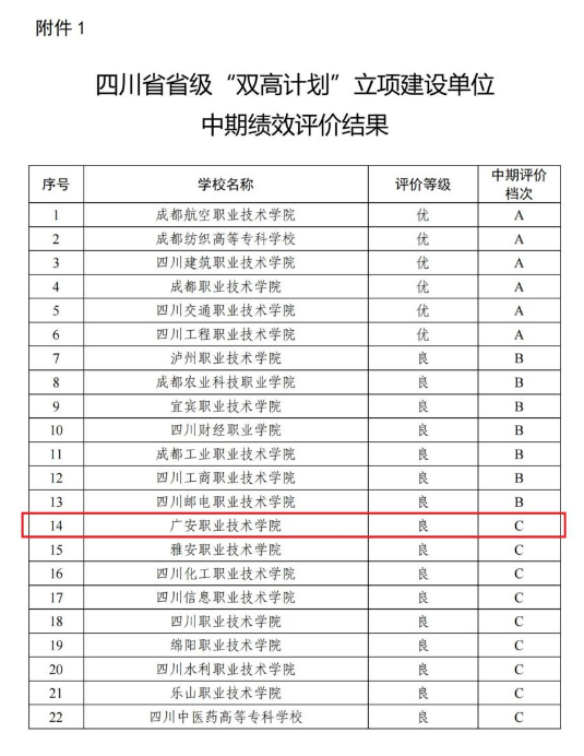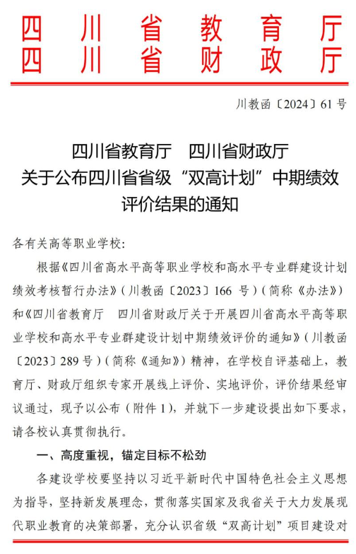2024年1月26日,四川省教育厅 四川省财政厅发布了《关于公布四川省省级“双高计划”中期绩效评价结果的通知》(川教函〔2024〕61号),ac米兰官网中文网站省级“双高计划”中期绩效评价等级为“良”,排位由立项时的第20名跃升至第14名,成为C档第1,这是对学校“双高计划”建设成效的高度肯定,也彰显学校教育教学水平在实施“双高计划”建设以来正不断提升。